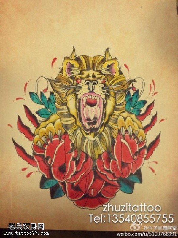 金黄色玫瑰花狮子纹身图案
