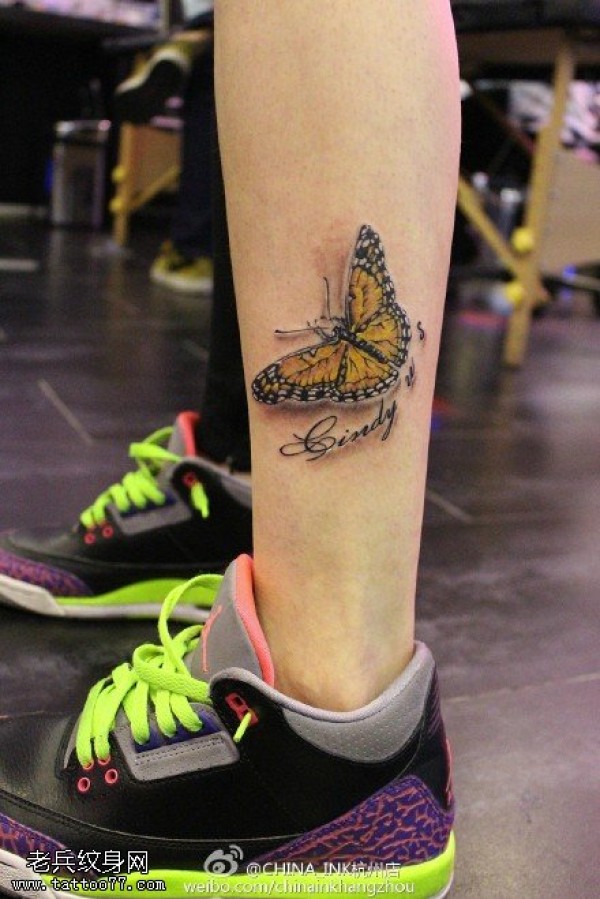 腿部栩栩如生飞翔蝴蝶纹身图案