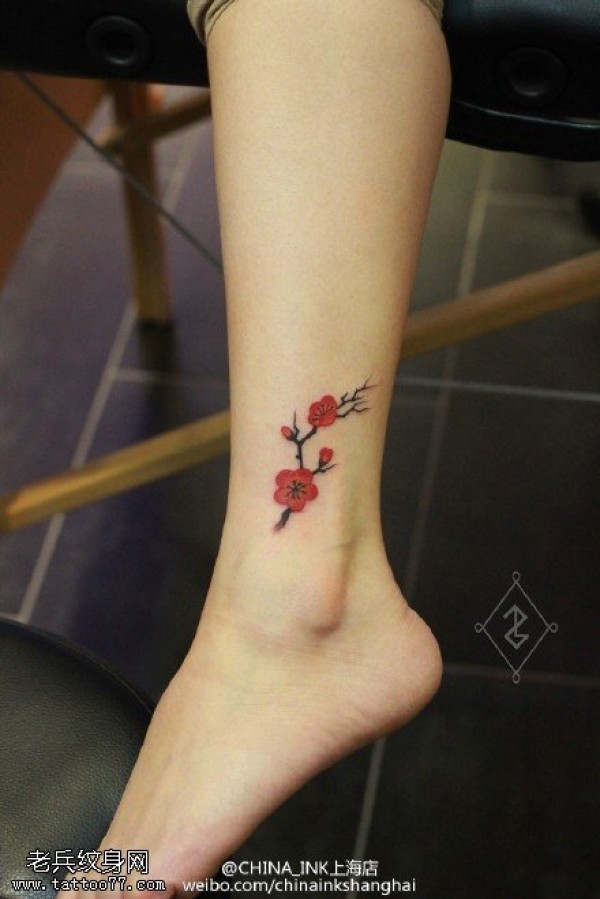 腿部点刺红色梅花纹身图案