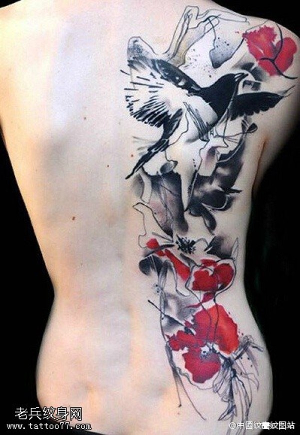满背黄鹂鸟水墨红色花纹身图案