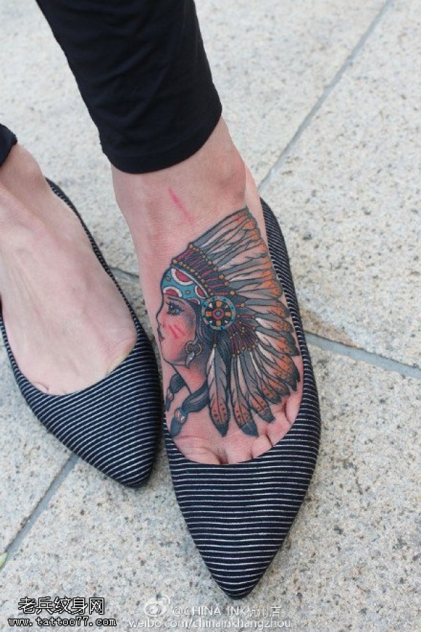 脚部点刺赤红色羽毛印第安纹身图案