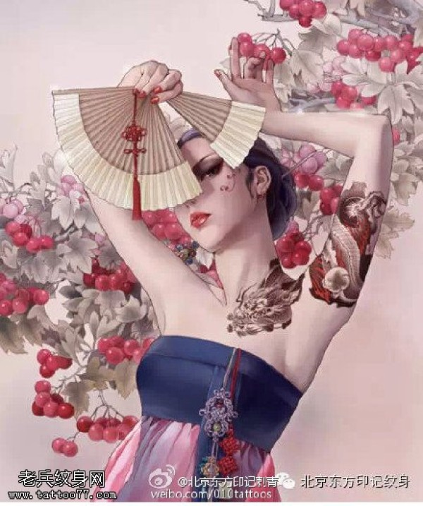 经典的扇子美女手稿纹身图案