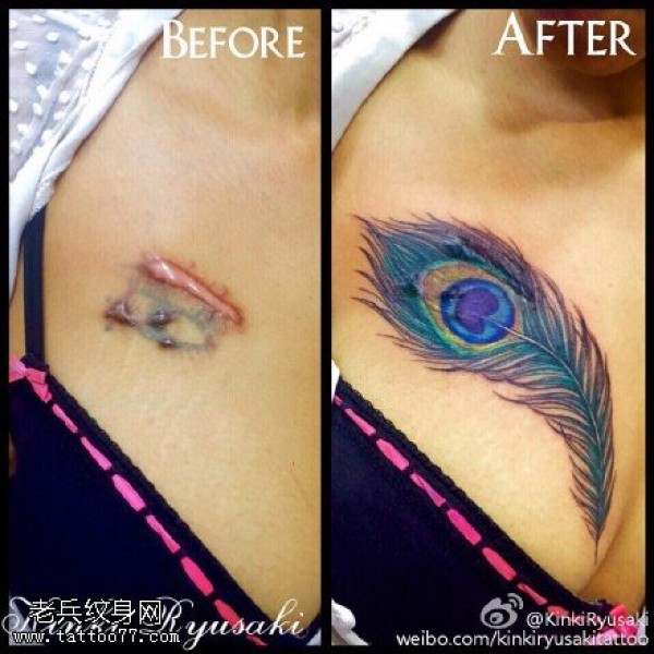 漂亮的羽毛遮疤纹身图案