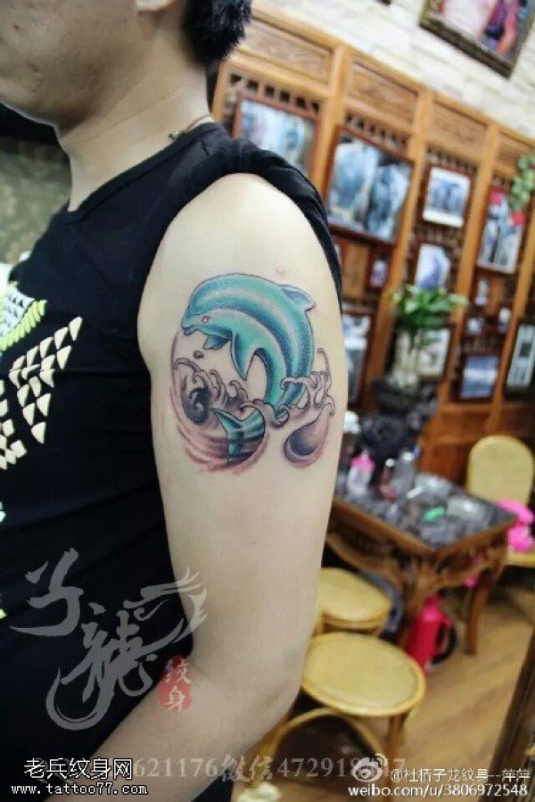 肩部部蓝色小海豚纹身图案