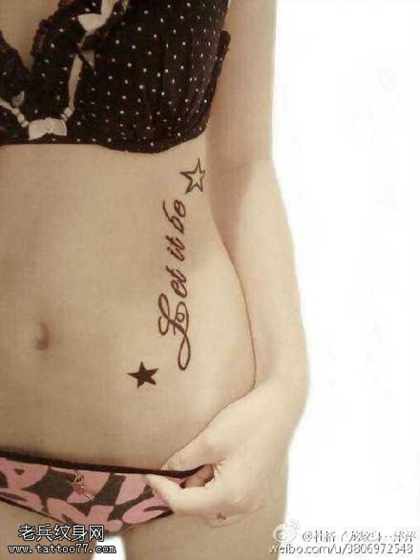 美女侧腹花体英文五角星纹身图案