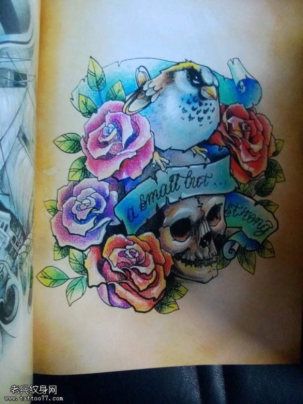 黑灰色玫瑰花和骷髅头纹身图片手稿