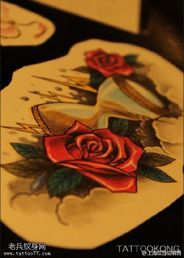 玫瑰镶嵌的沙漏手稿纹身图案