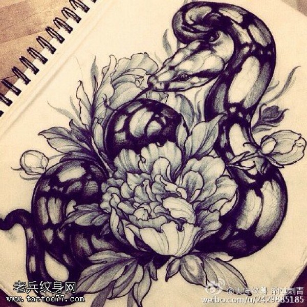 传统刺青蛇戏牡丹手稿纹身图案