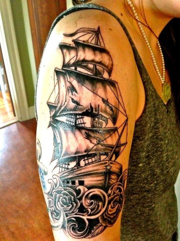 一套好看的手臂大船纹身图案