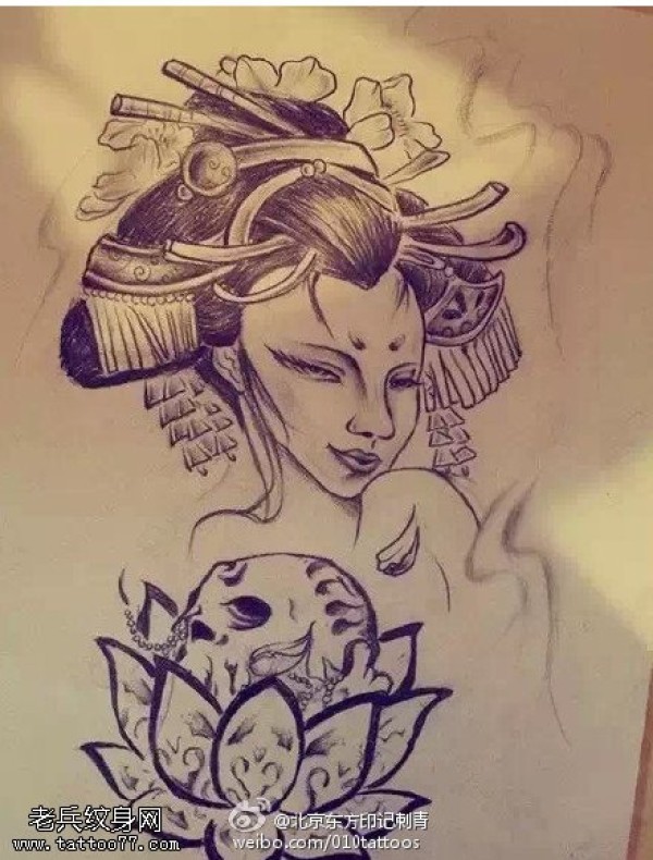 黑白莲花艺妓手稿纹身图案