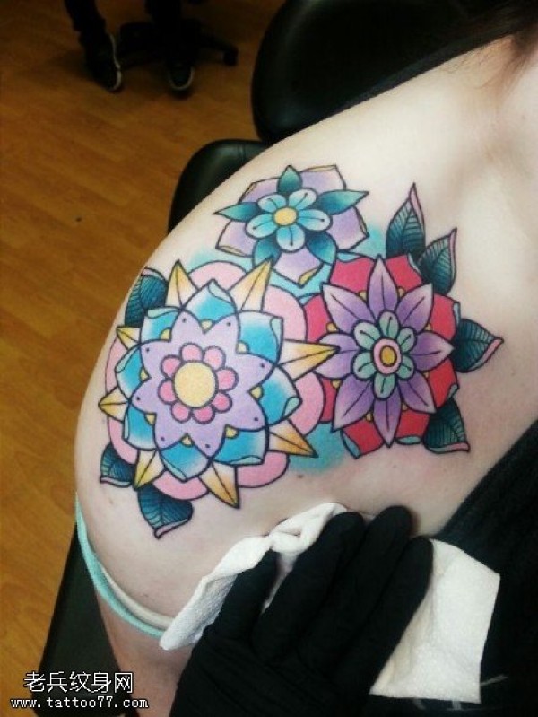 女生肩花纹身_15张女性双肩对称的肩花纹身图案作品图片