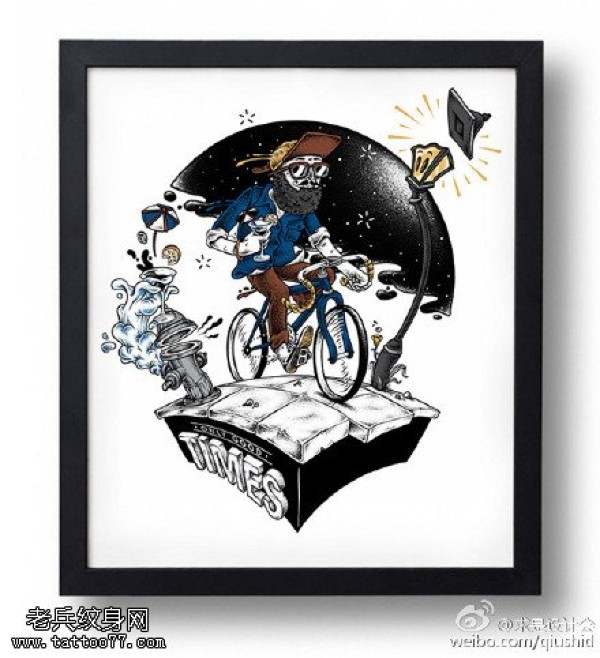 手拿鸡尾酒骑单车男人漫画纹身图案