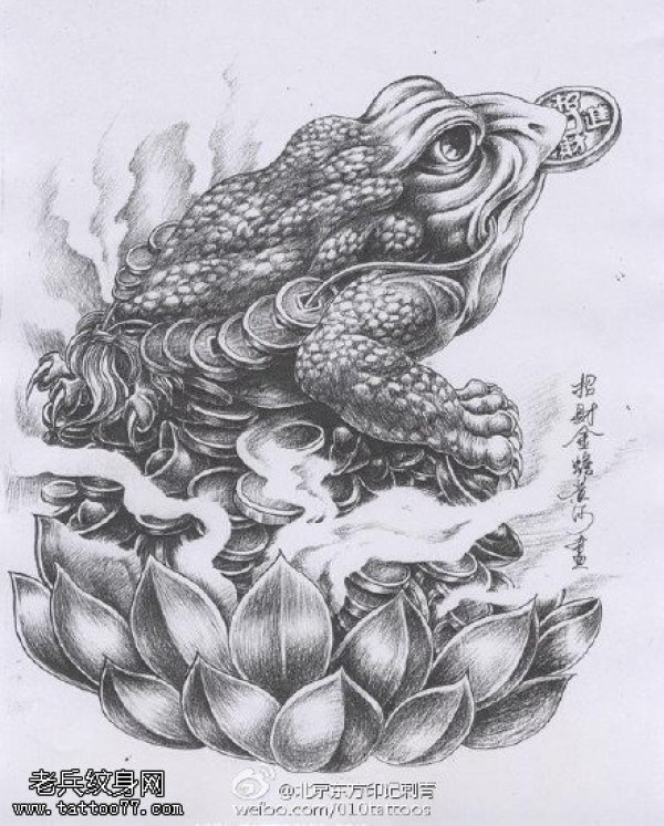 黑白莲花座金蟾手稿纹身图案