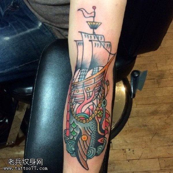 欧美风彩绘帆船纹身图案