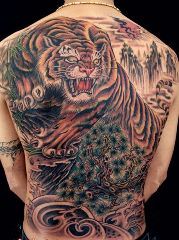 霸气下山虎半甲后背纹身