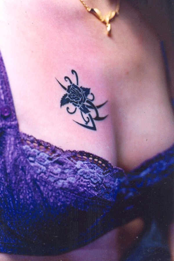 巨乳美女胸口上的性感玫瑰纹身图案