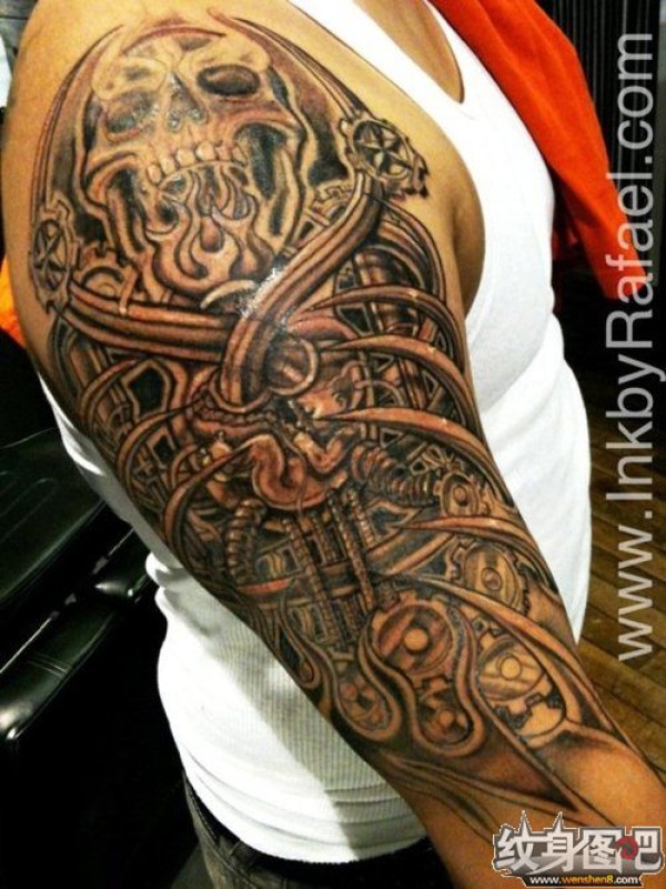 黑灰机械骷髅包大臂纹身图案