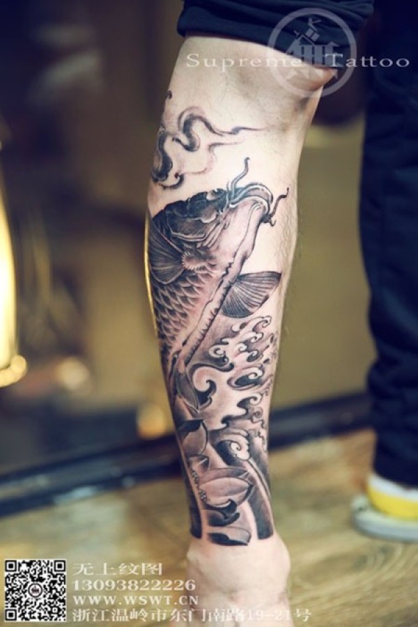 传统鲤鱼花小腿纹身_腿部纹身图案大全_纹身图吧