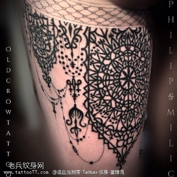 大腿漂亮的蕾丝边纹身图案