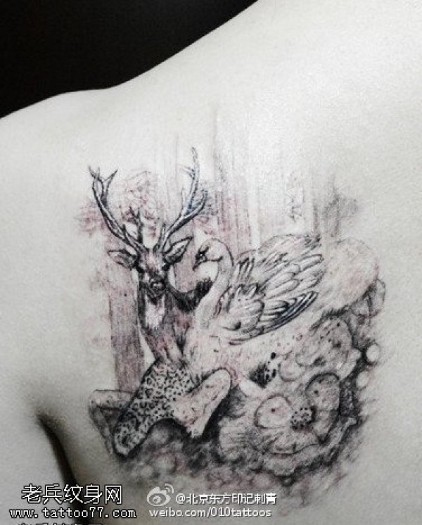 水墨羚羊与白鹅纹身图案