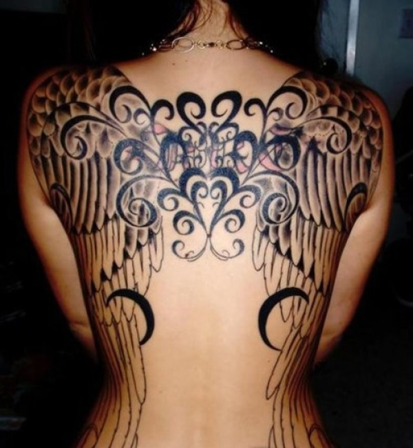 女生后腰纹身黑白灰风格抽象线条纹身图案