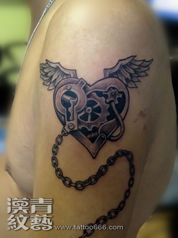 大臂上的机械心纹身图案