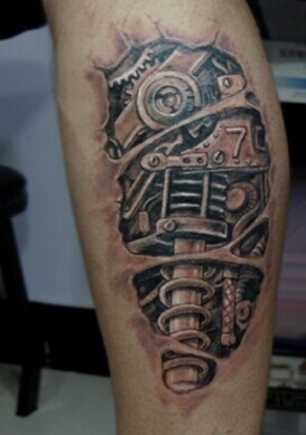 男人小腿炫酷的3d机械纹身
