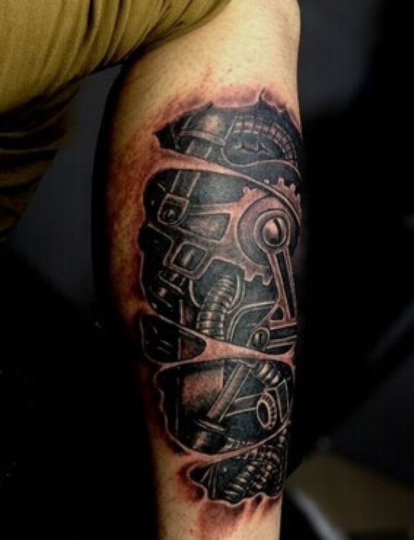 男人小腿炫酷的3d机械纹身