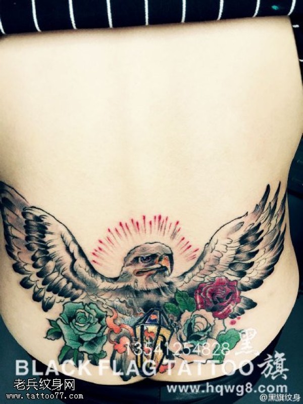 彩色飞鹰展翅彩色玫瑰纹身图案