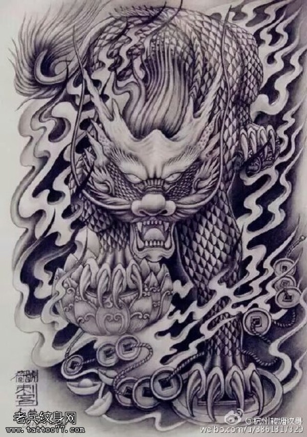 龙纹身手稿_一组老传统黑灰龙手稿纹身图案
