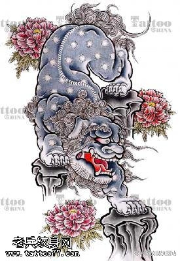 精美霸气的牡丹花唐狮纹身图案
