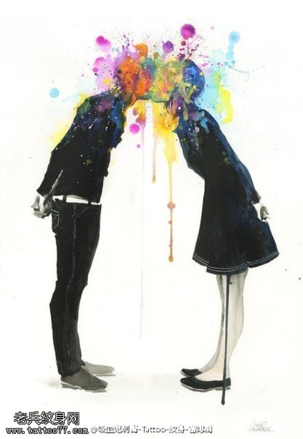 经典水彩风情侣相吻纹身图案