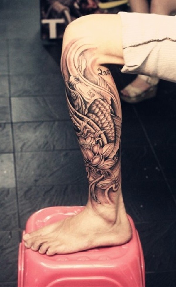 传统鲤鱼花小腿纹身_腿部纹身图案大全_纹身图吧