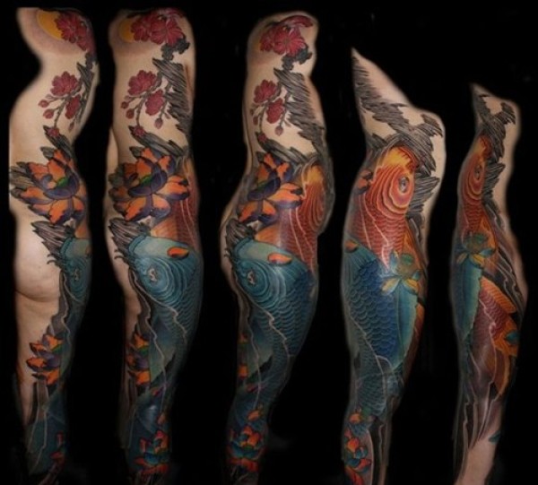 传统鲤鱼花小腿纹身_腿部纹身图案大全_纹身图吧