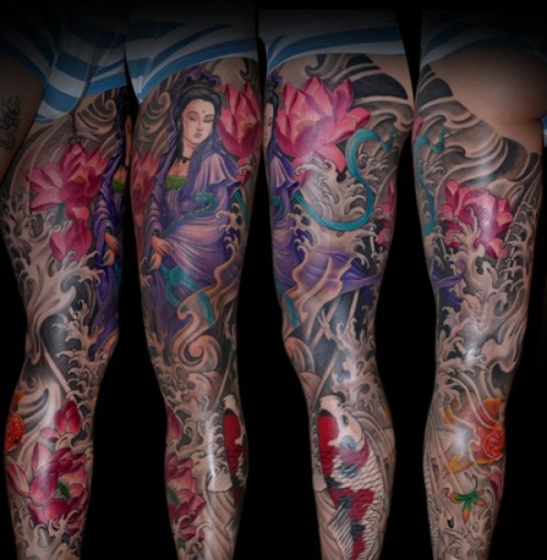 日式风格的传统花腿纹身作品欣赏