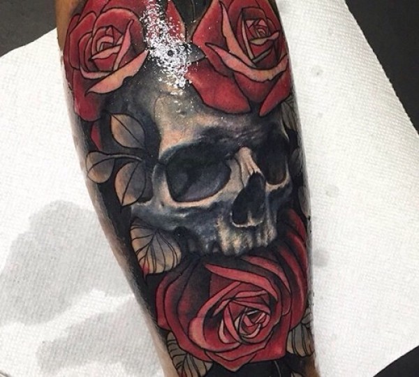 女生手臂经典潮流的骷髅与玫瑰花纹身图案