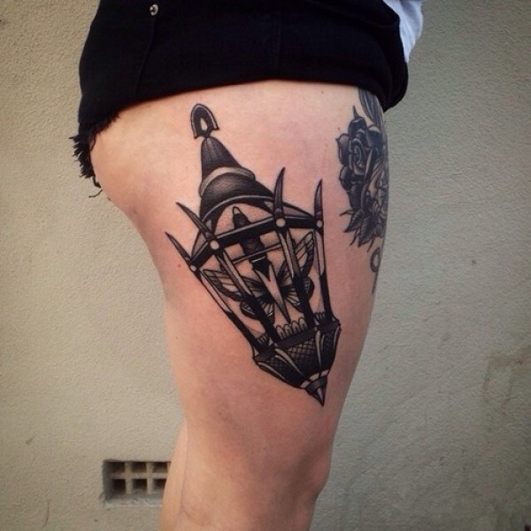 大腿部神灯纹身 鳄鱼纹身 骷髅纹身