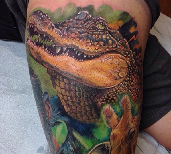 大腿部神灯纹身 鳄鱼纹身 骷髅纹身