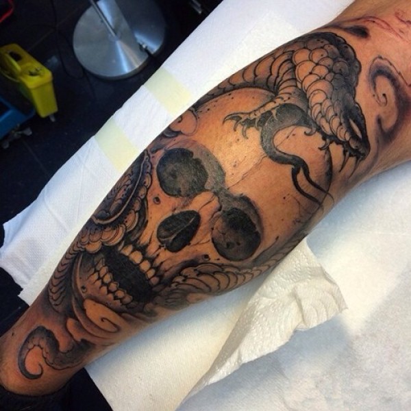 超帅时尚的黑灰骷髅与蛇纹身图案