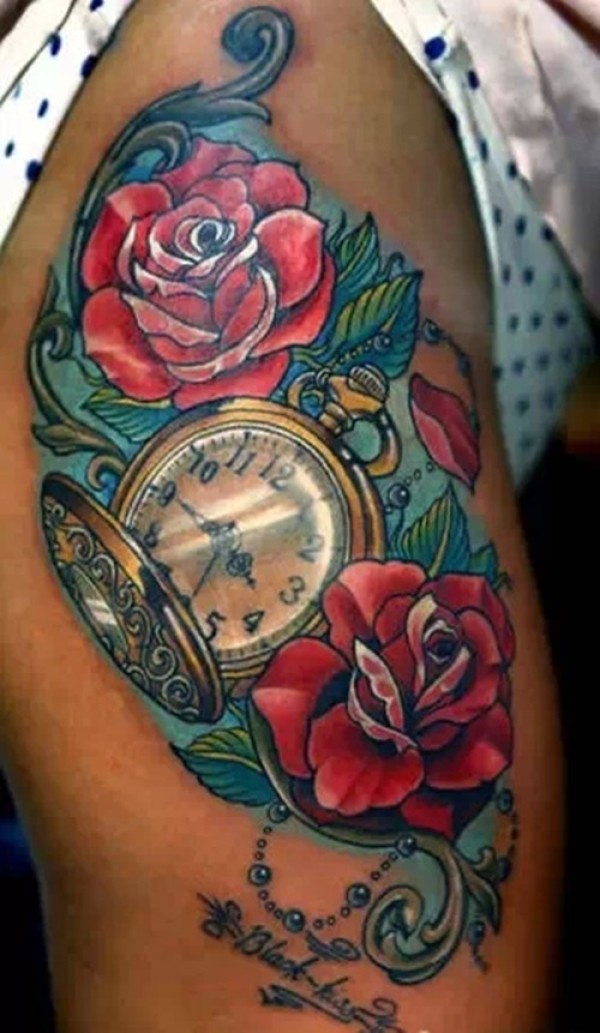 唯美的钟表玫瑰纹身