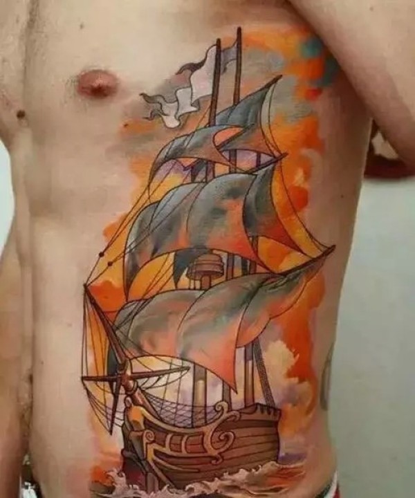 腰腹部帆船纹身