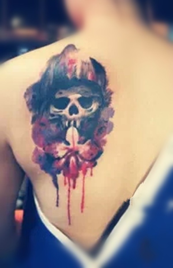 女生后背唯美时尚的小骷髅纹身图案