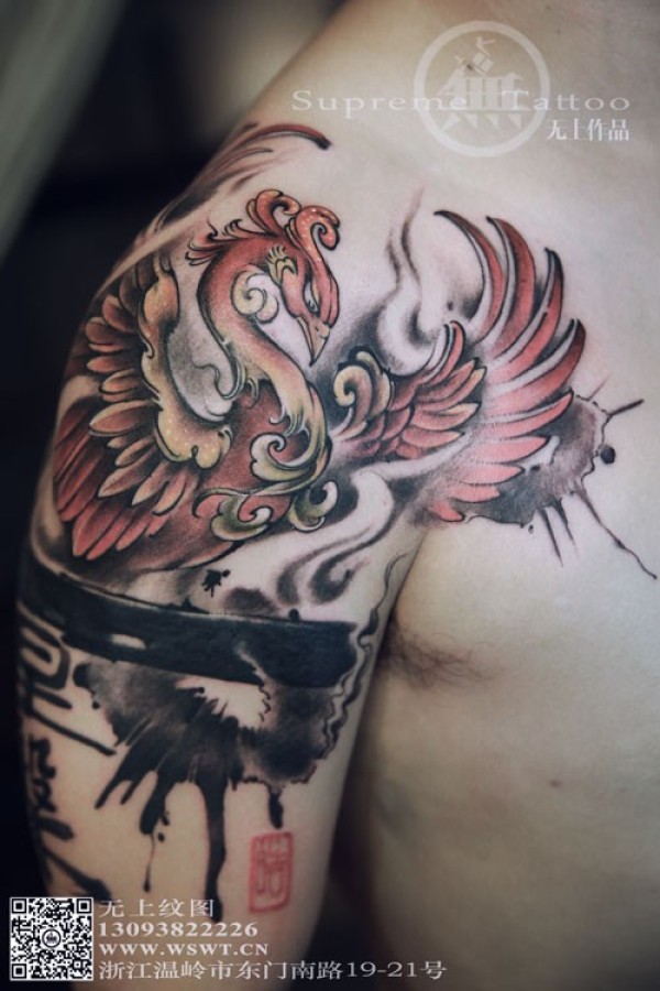 “涅槃”修改添加 泼墨&彩色凤凰纹身 花臂纹身