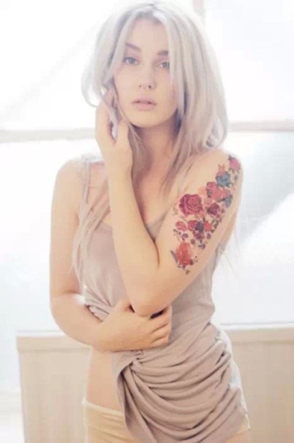 女性肩膀上多款漂亮的花朵纹身图案