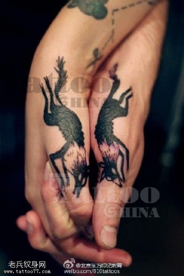 情侣手指上的大灰狼纹身图案