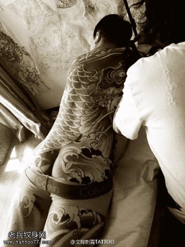 全身海浪大锦鲤纹身图案