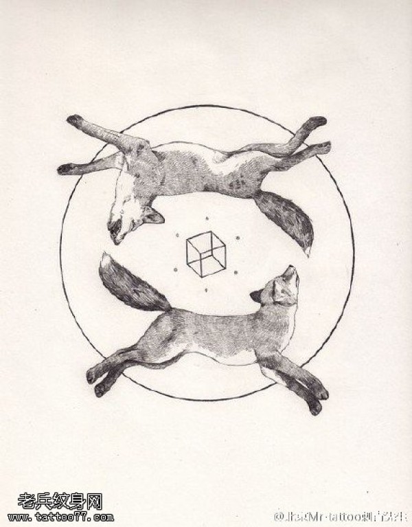 经典两只狼图腾手稿纹身图案