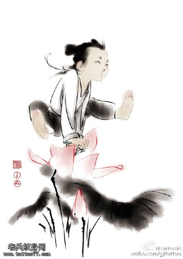 中国风水墨莲花童子纹身图案