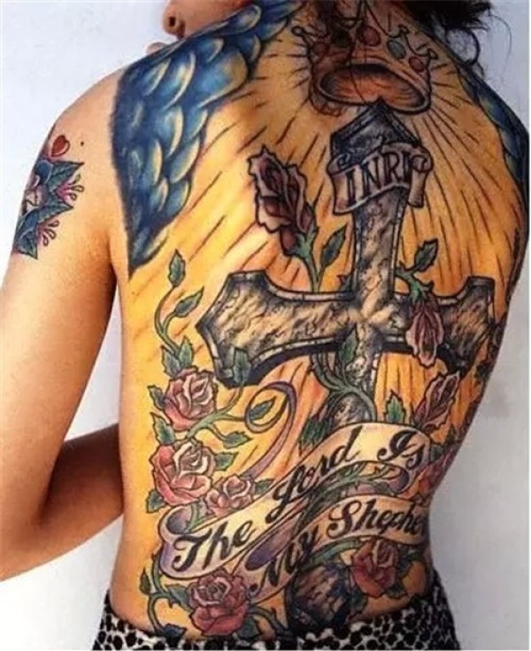 超帅气的背部十字架纹身