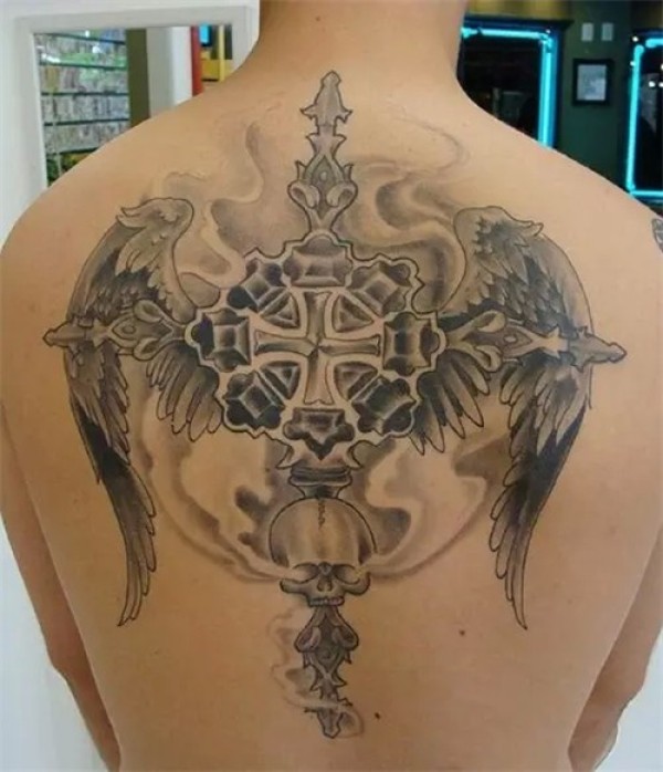 超帅气的背部十字架纹身